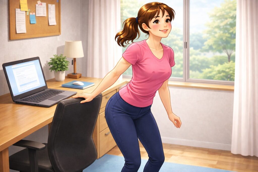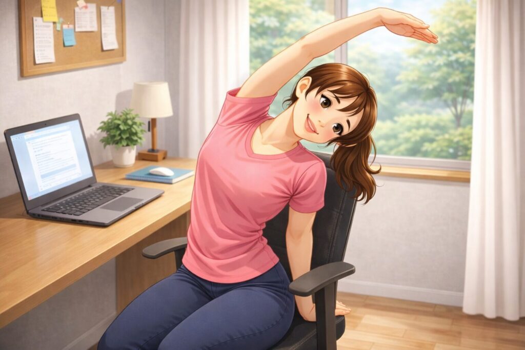 肩甲骨周り・胸を開くストレッチは、血流改善と筋緊張のリリースに効果的。長時間座りっぱなしの眠気を軽減します。