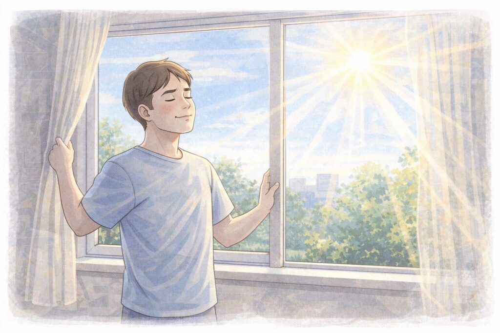 朝日は体内時計をリセットし、夜に睡眠ホルモン(メラトニン)が分泌されるタイミングを整えます。