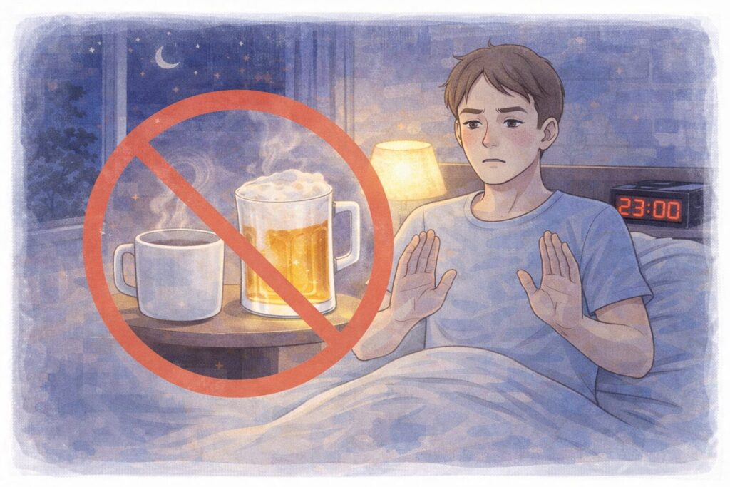 カフェインは覚醒作用が長時間続き、アルコールは入眠を助ける一方で、夜中の覚醒を増やすことがはっきり分かっています。