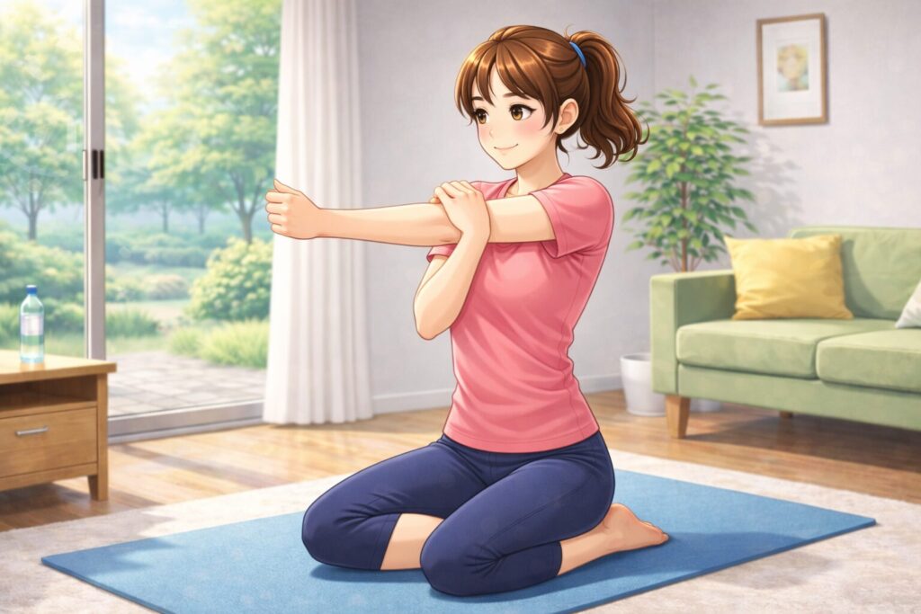 - 胸の前に引き寄せるようにして肩の後ろを伸ばす