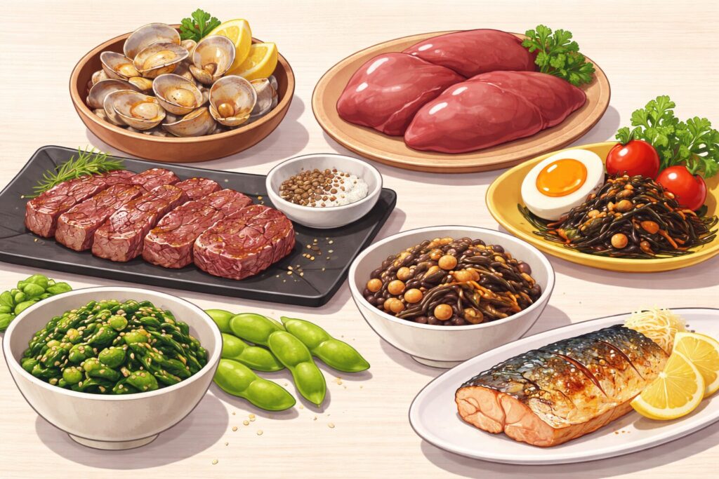 - 赤身肉、レバー、魚、豆類を取り入れる
