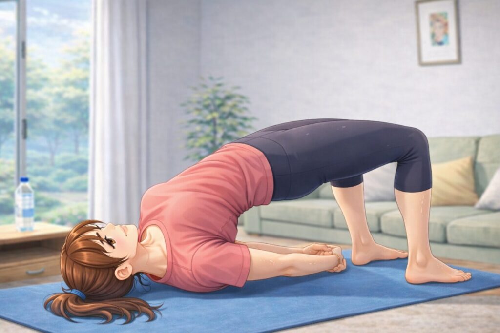 橋のポーズはお尻や背中の筋肉をやさしく刺激し、体力づくりにも役立つヨガポーズです。