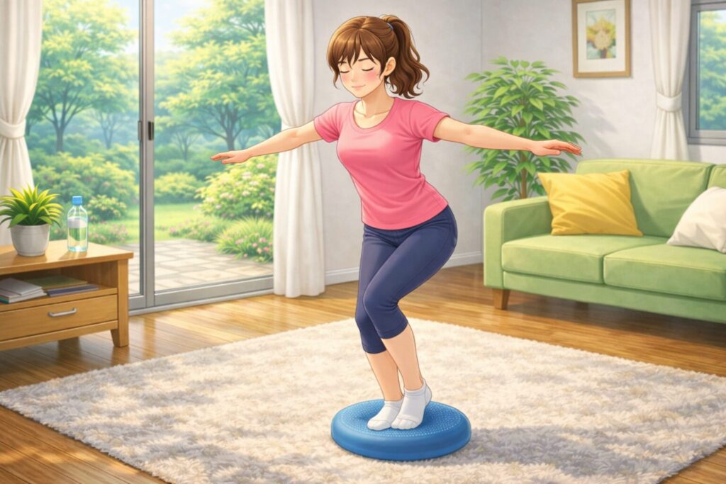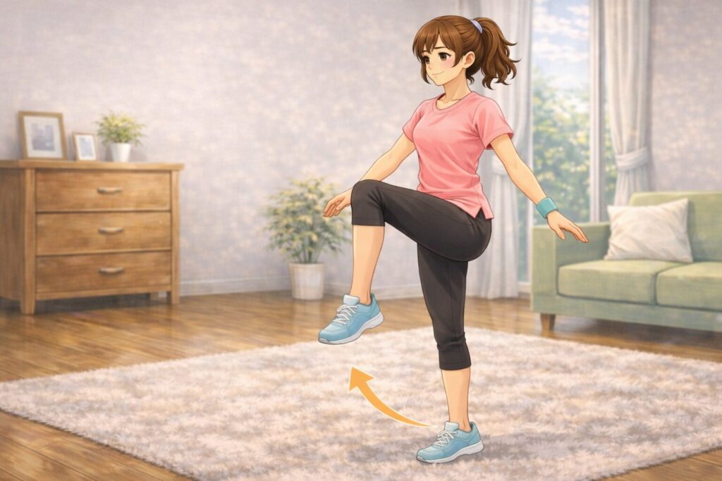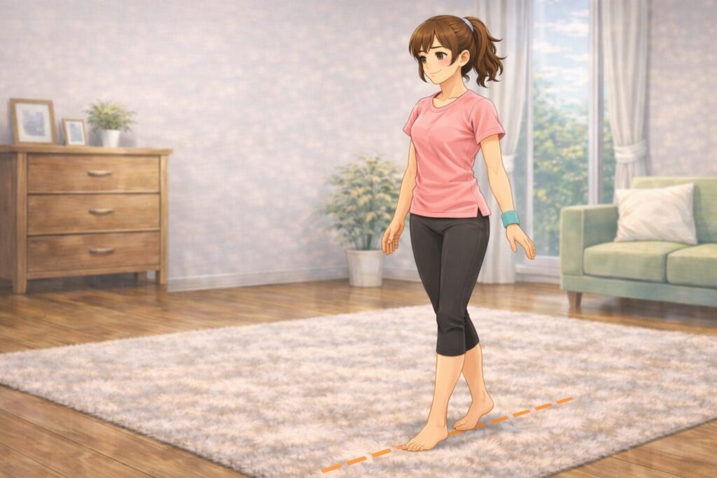 視線は足元ではなく、前方の一点を見ると安定しやすい。ふらつく場合は、壁や椅子の近くで行いましょう。