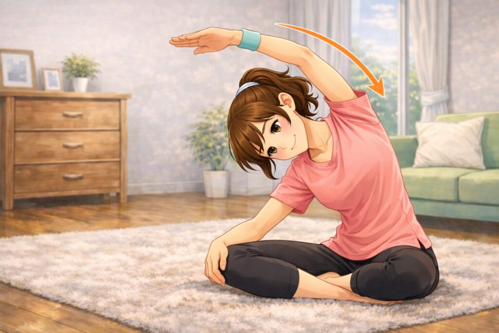 - 上げた腕側へ、体をゆっくり倒す