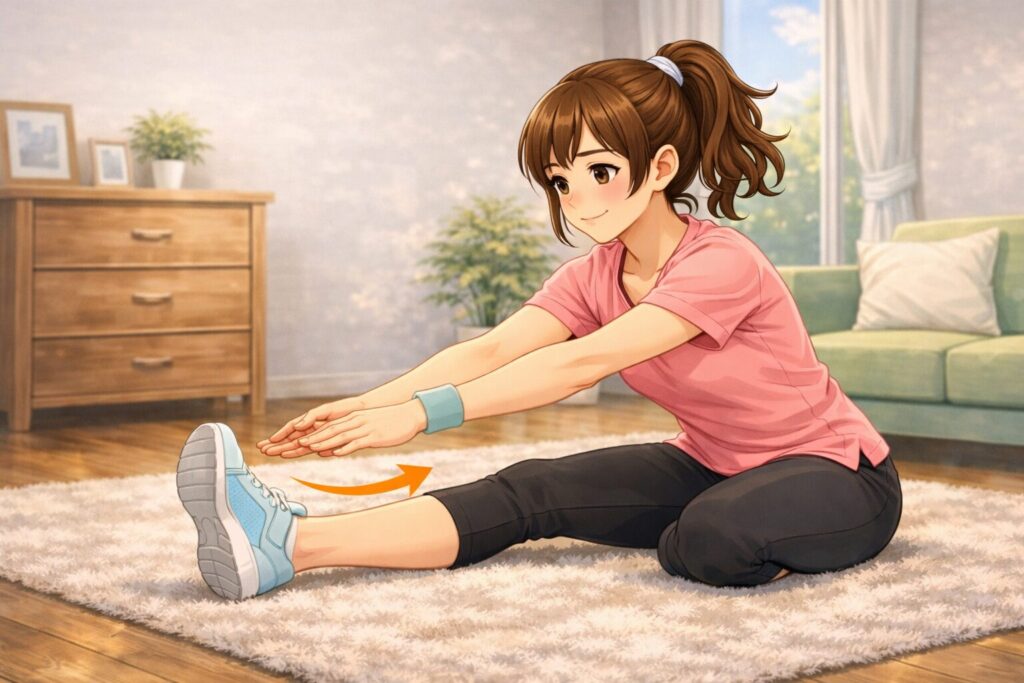 - 床に座り、両脚を前に伸ばす
