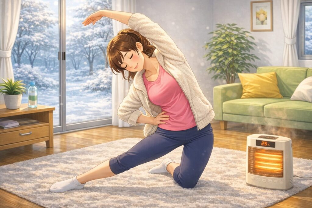 暖かい環境では筋温が上がり、筋肉が伸びやすい状態を維持できるため柔軟性向上に有利です。