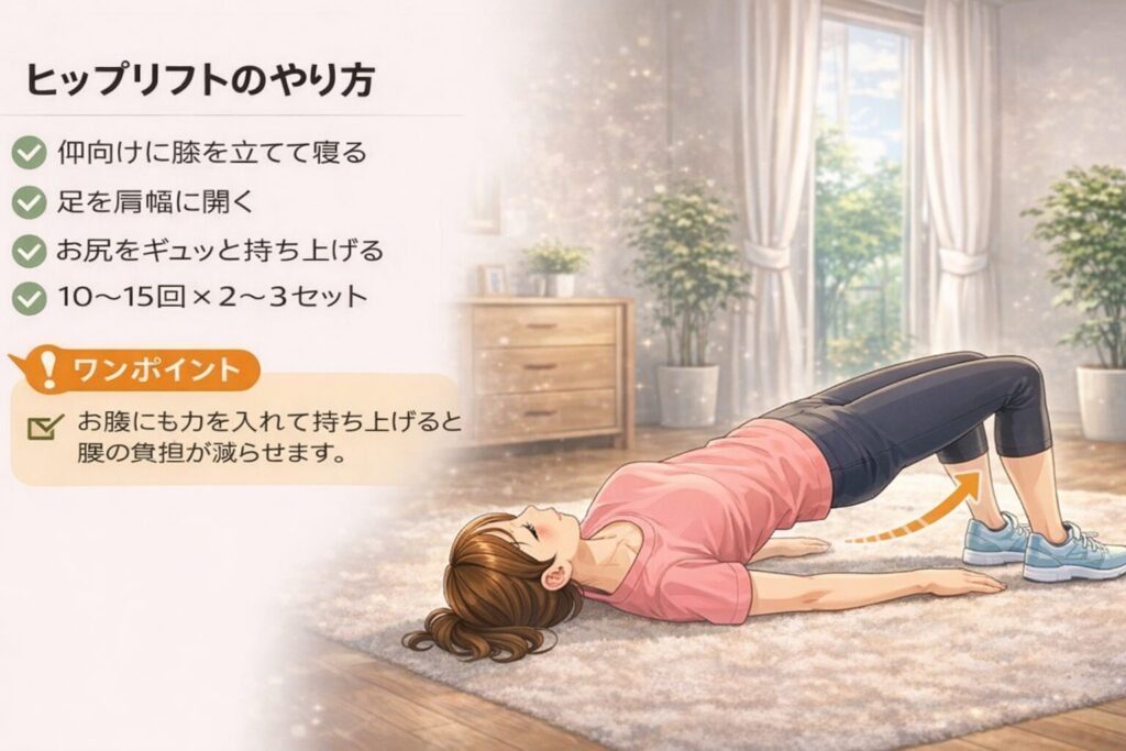 腰を反らせすぎず、「お尻を締める」意識で行いましょう。