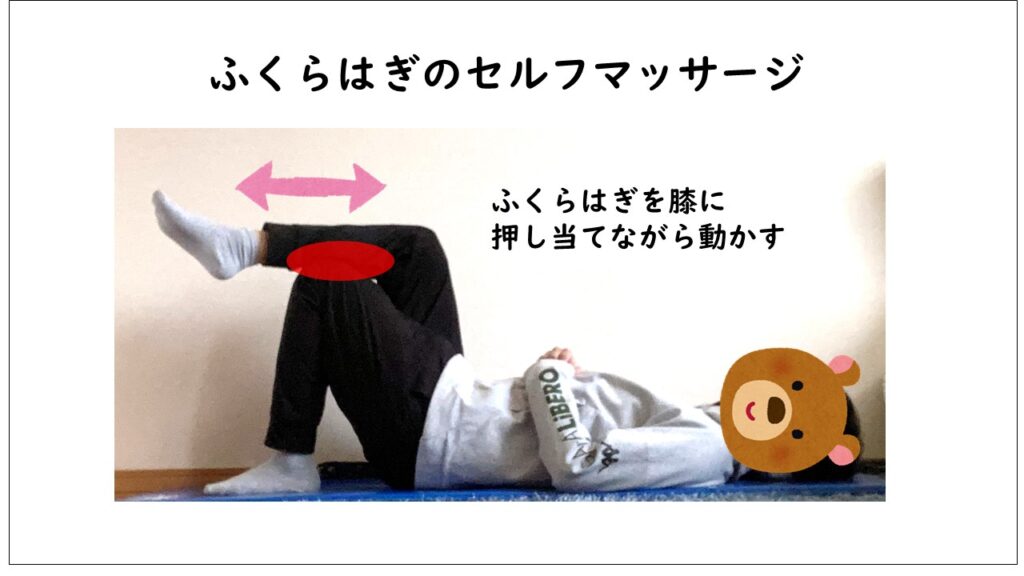 - ふくらはぎの内側・外側・中央を、膝にあてて 左右に軽く動かして“ぐりぐり”ほぐす。