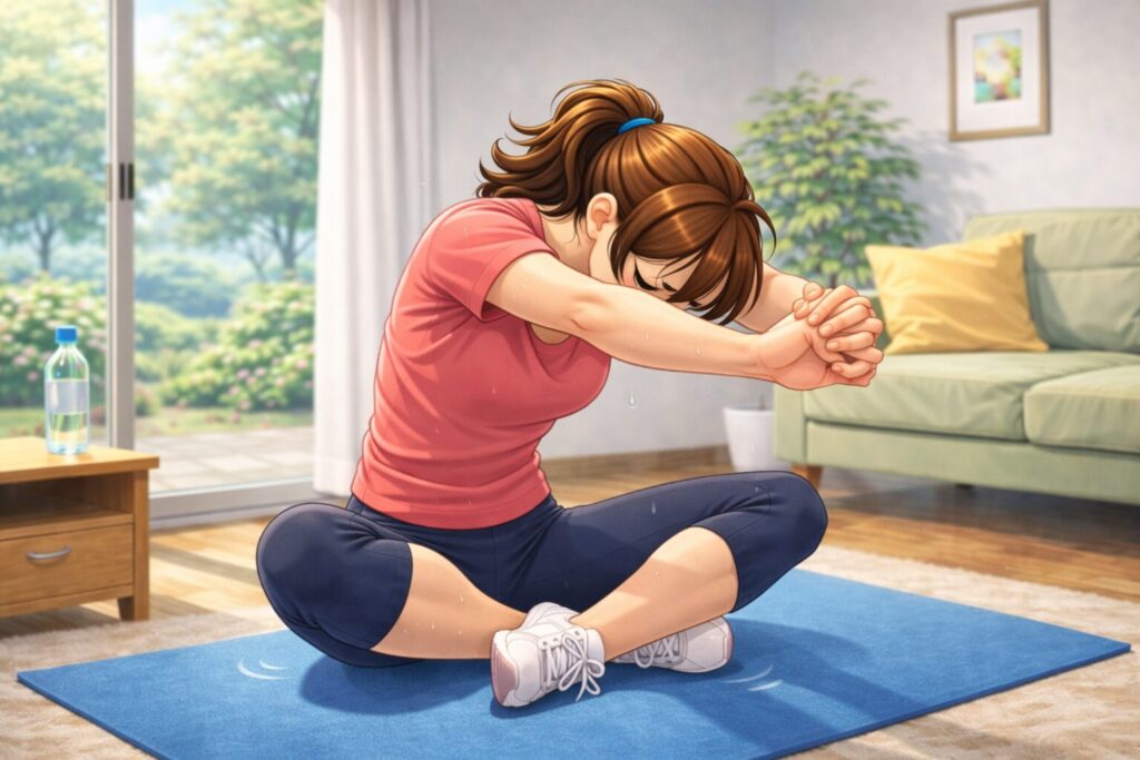 - 肩・脇の下・胸の前側が心地よく伸びる位置で20〜30秒キープ
