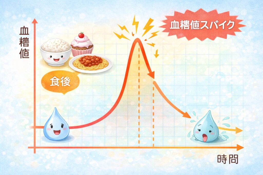 「血糖値スパイク」とは、食後に血糖値が急激に上がり、短時間で下がる現象のことです。