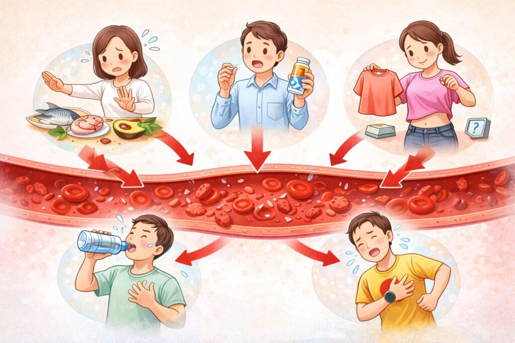 この記事では、「〇〇を食べれば大丈夫」といった単純な話ではなく、科学的に効果が確認されている方法だけを厳選し、日常生活で実践しやすい「血液をサラサラにする方法」を紹介します。
