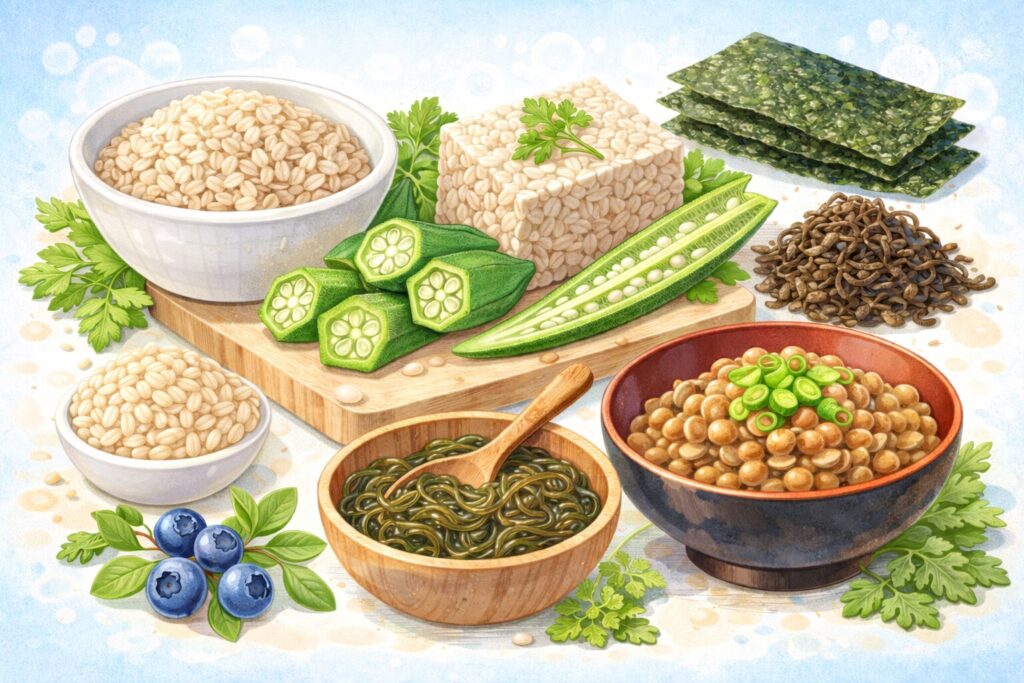 - 海藻、オートミール、大麦、納豆、オクラ