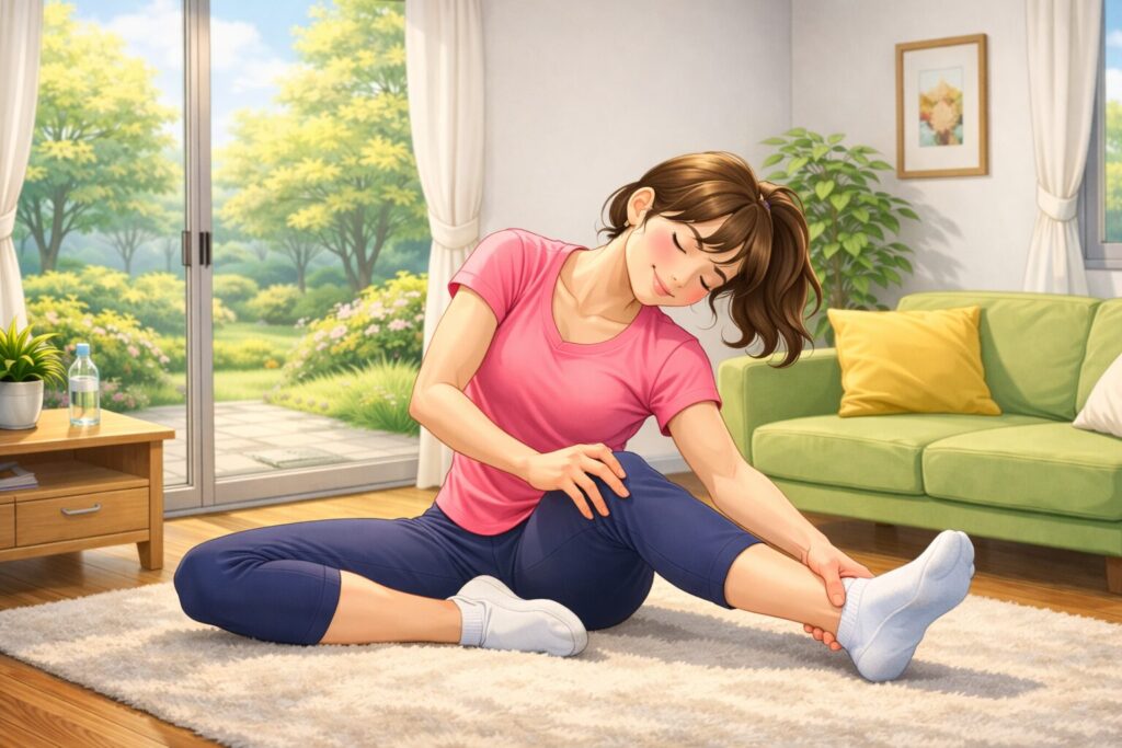 - 床に座り、片脚を伸ばしもう片脚は軽く曲げる