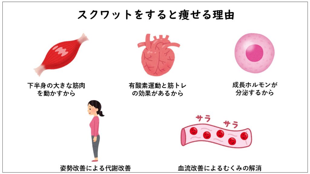 スクワットは「痩せる運動」として代表的です。理由は以下の通りです。