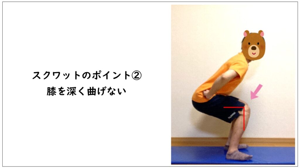 「深くしゃがむほど効果的」と思われがちですが、膝に不安がある人は無理に深くしゃがむ必要はありません。太ももが床と平行になるくらいで十分です。