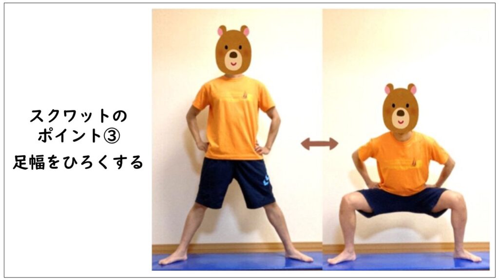 - 足を肩幅より広く開き、つま先はやや外側に向ける