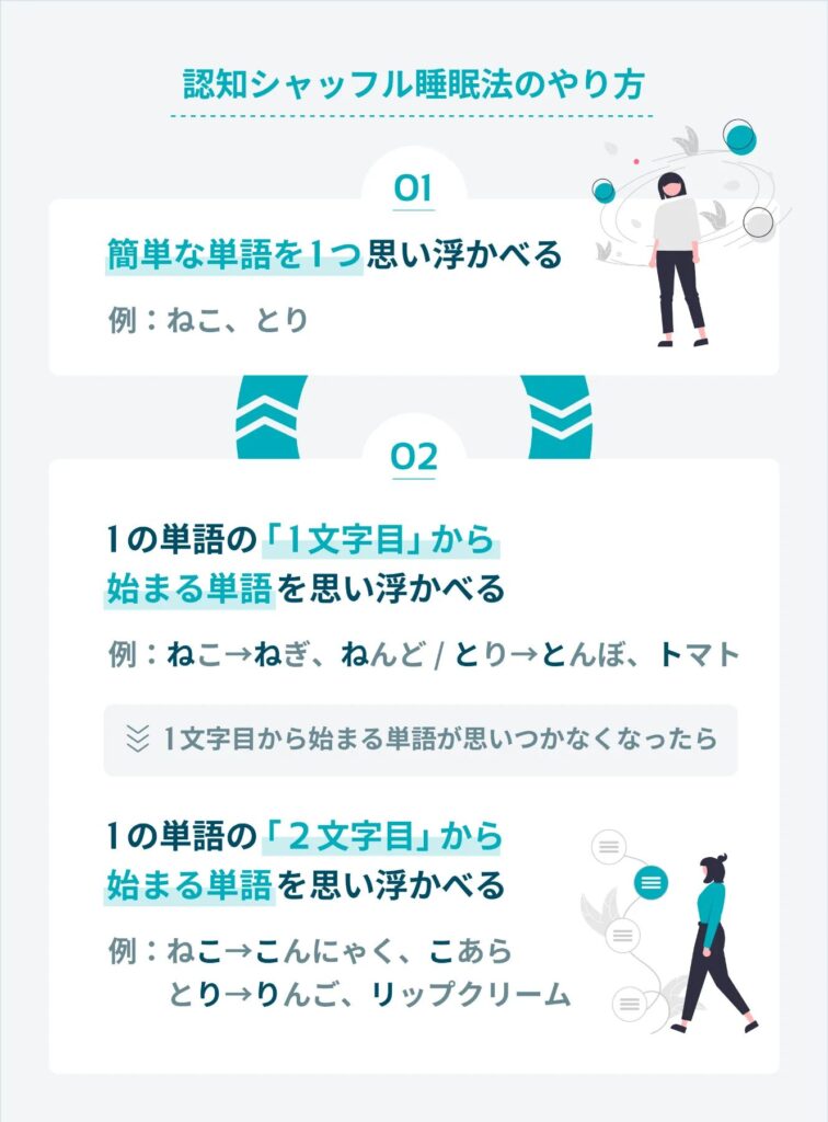 「認知的シャッフル」では、脈絡のない単語を順に思い浮かべることで論理的思考を強制的に停止させ、