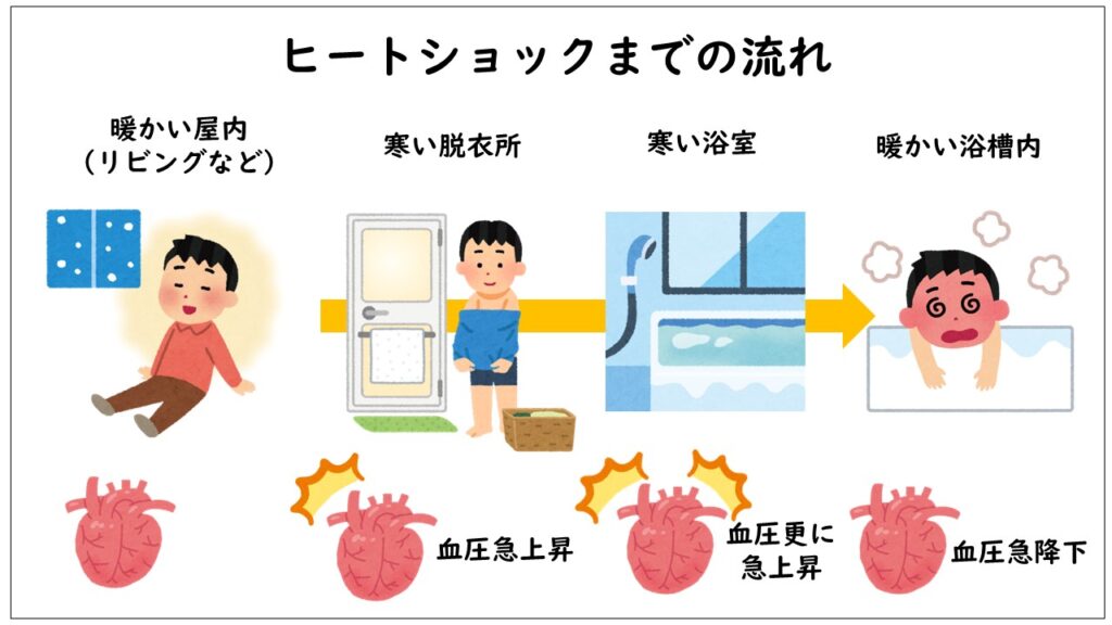 その状態で入浴や寒冷刺激を受けると、血圧や心拍が急変しやすくなり、ヒートショックのリスクが高まります。