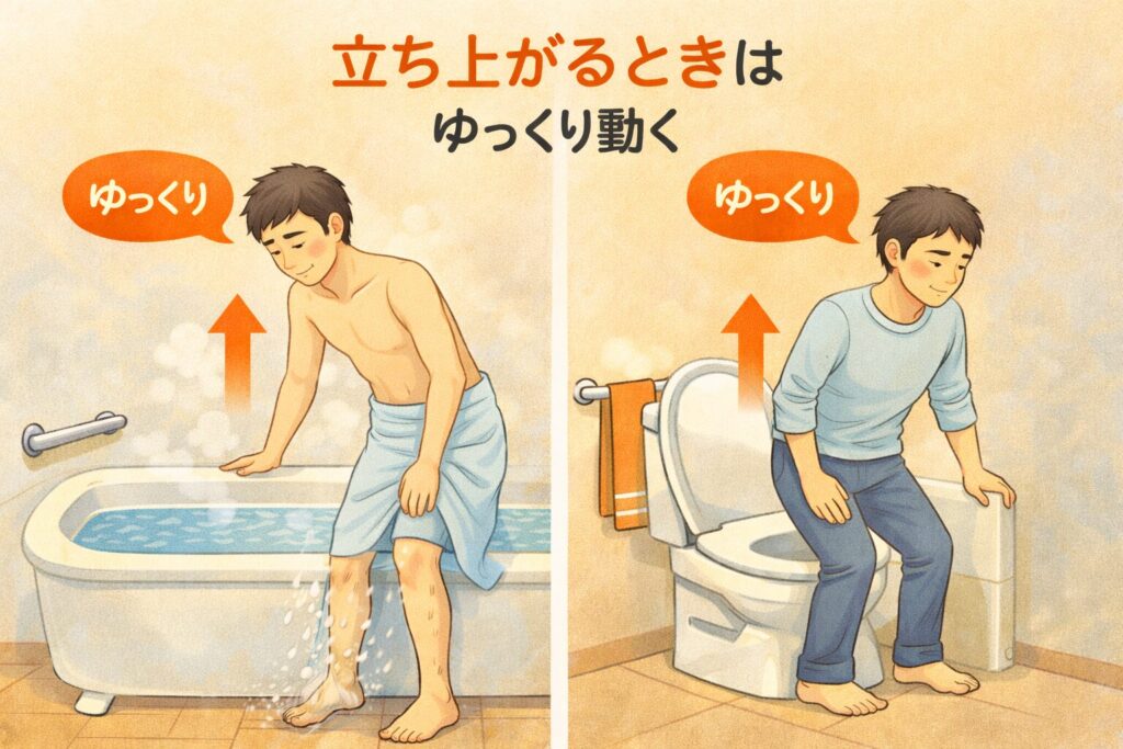 入浴後やトイレ後は特に起こりやすいため、動作をゆっくり行うことが重要です。