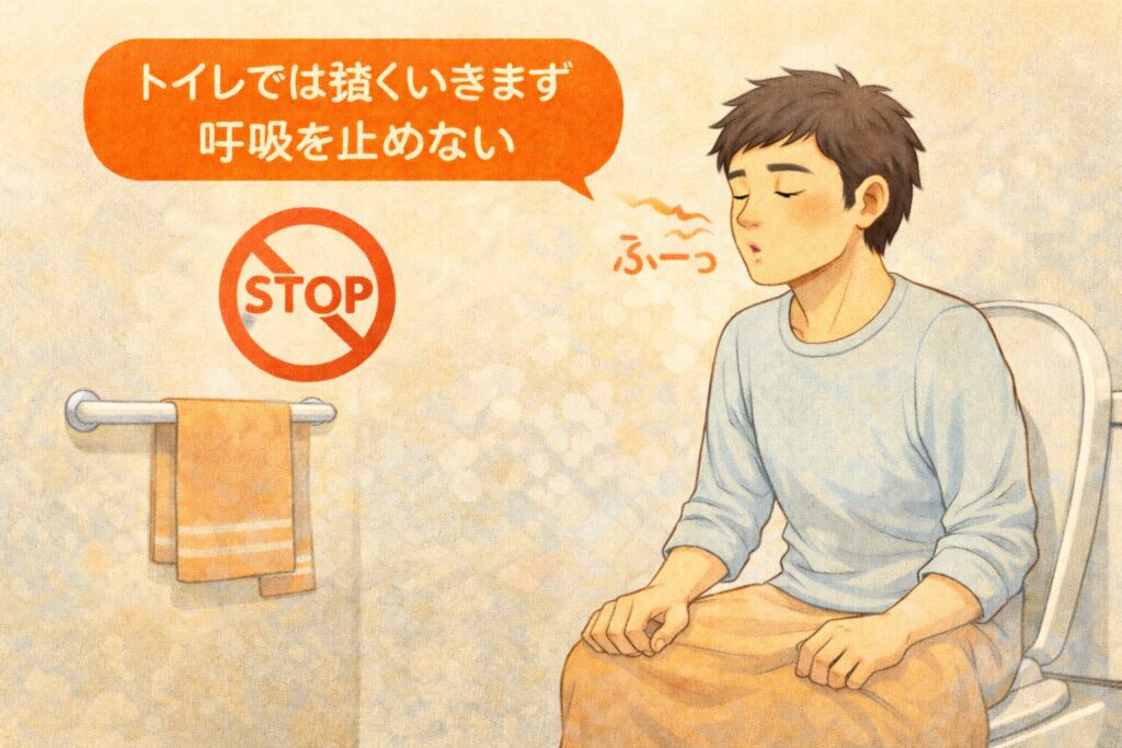 強くいきむ動作は、腹圧を急激に高め、血圧を上昇させます。
