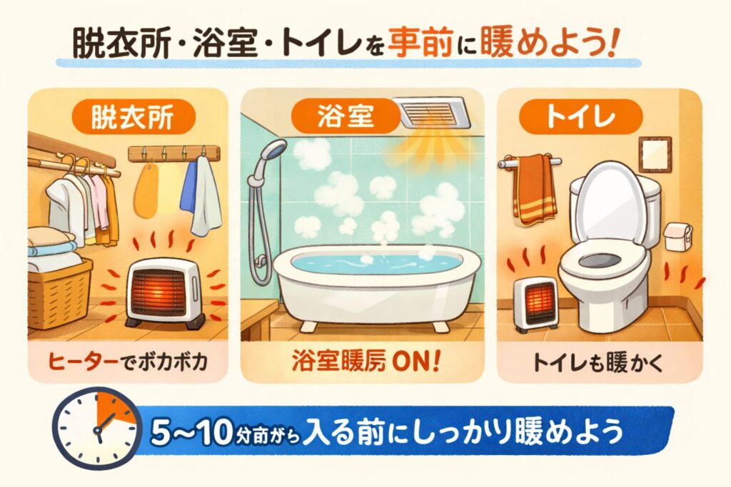 「寒くない」と感じる環境づくりが目安です。暖房は入浴やトイレに入る5〜10分前から使いましょう。