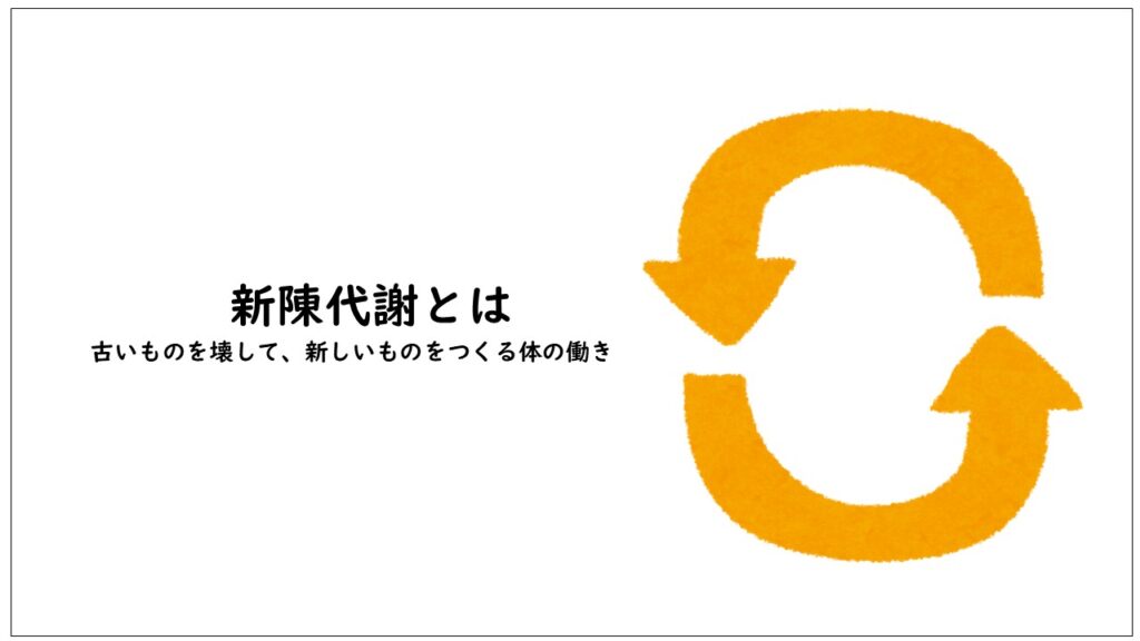 「新陳代謝」とは、古い細胞を壊して、新しい細胞をつくる働きのことです。肌・髪・筋肉・内臓など、私たちの体は毎日少しずつ生まれ変わっています。