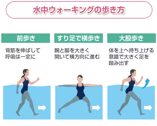 水中歩行とは水の浮力と抵抗を利用して歩く運動で、関節に負担をかけずに全身の血流と代謝を高める有酸素エクササイズです。